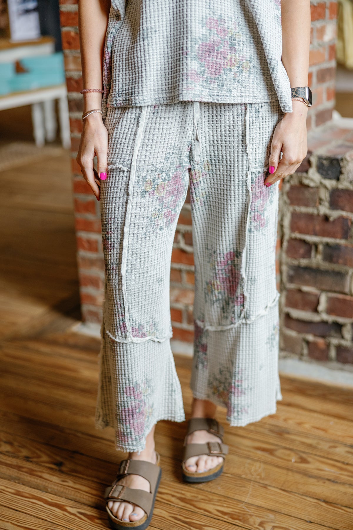 FLORAL PRINT WASHED WAFFLE PANTS