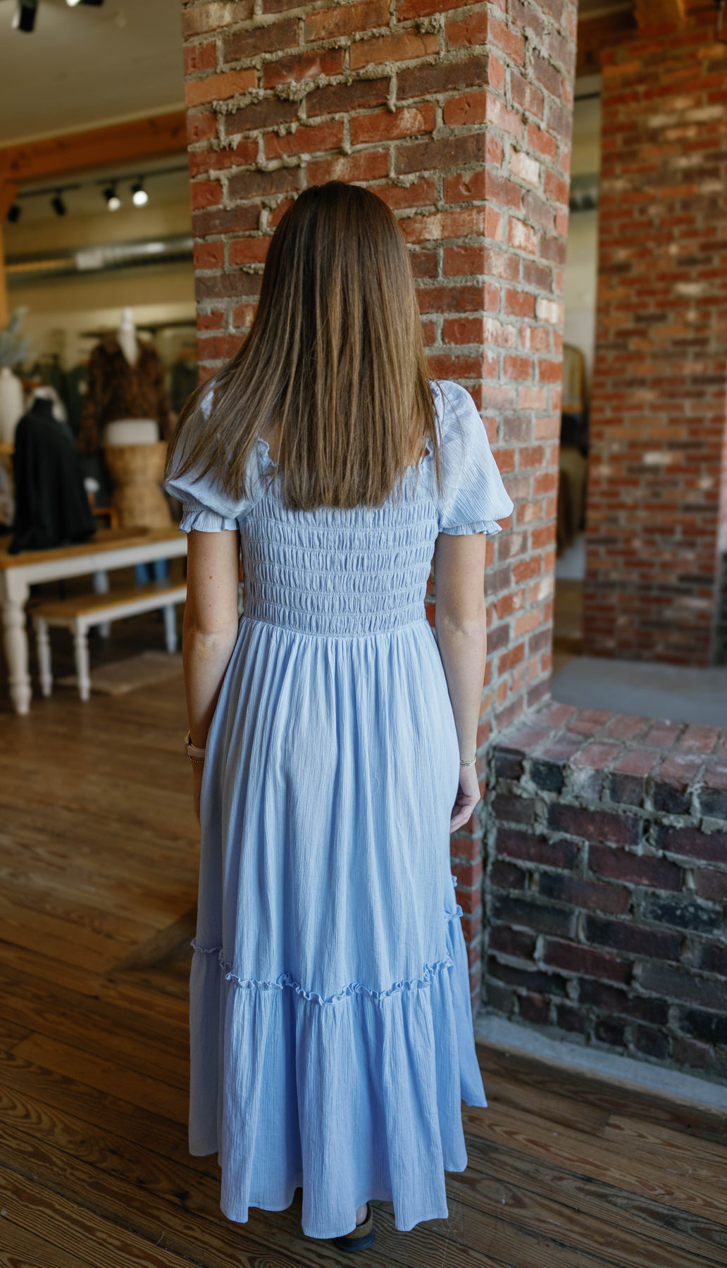 SMOCKED BUTTON DOWN MAXI DRESS FEATURING: - COTTON GAUZEY FABRICATION - SMOCKED BODICE FRONT AND BACK - FUNCTIONAL BUTTON DOWN DESIGN - ELASTIC SLEEVE ENDS - SIDE POCKETS - RUFFLED EDGE FLOUNCE - FULL LINING