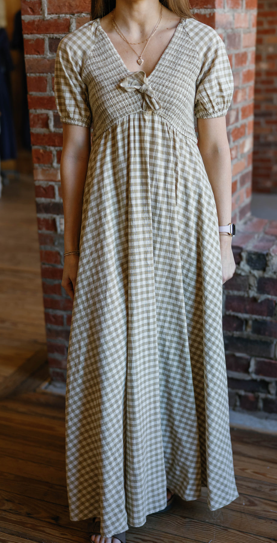 DARLING MAXI DRESS FEATURES: - COTTON GINGHAM FABRICATION - SMOCKED BODICE FRO NT AND BACK WITH REMOVABLE KNOTTED TIE - PUFF ELASTIC SLEEVES - SIDE POCKETS