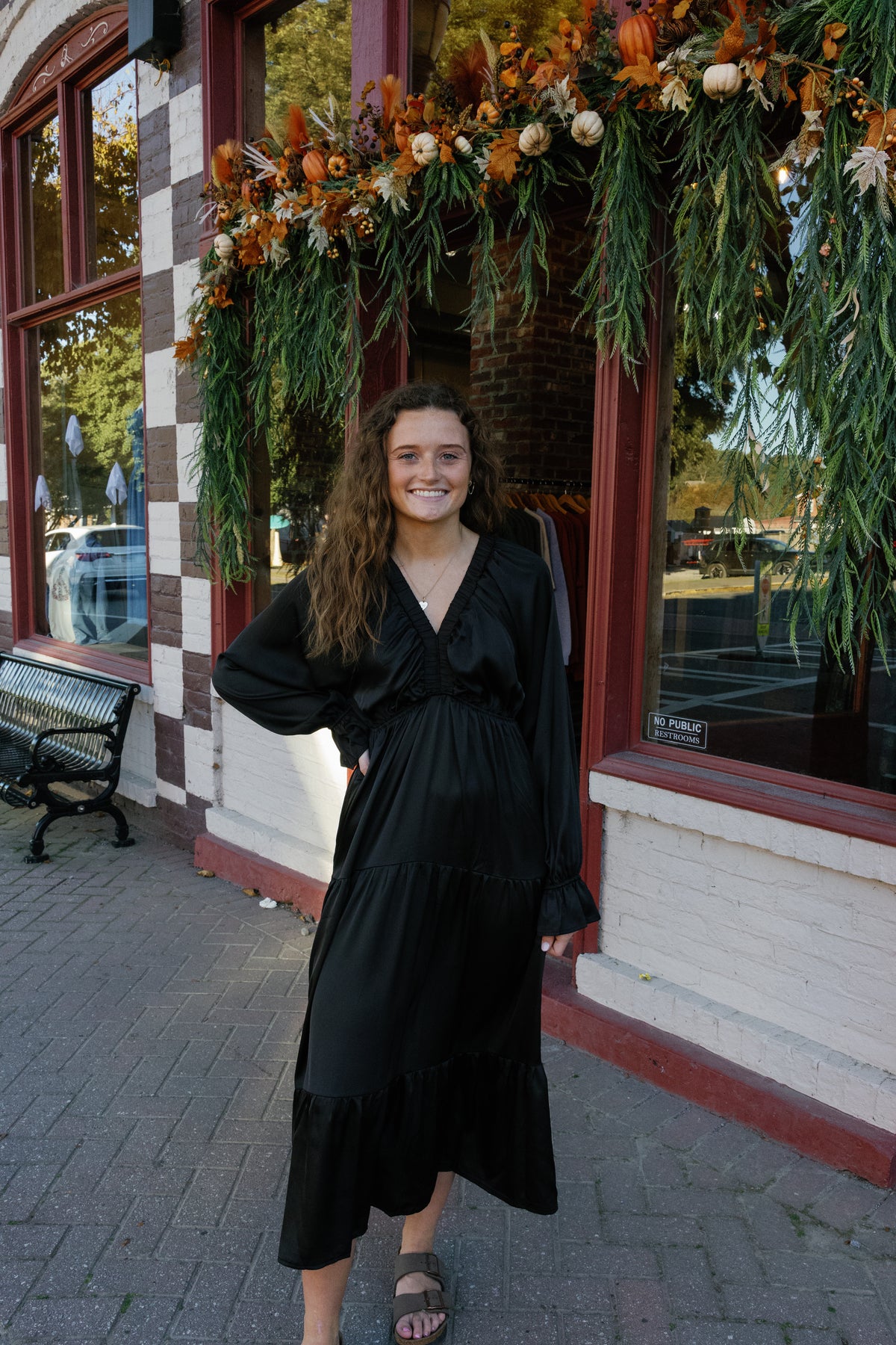 V NECK WITH ELASTIC BUBBLE LONG SLEEVE SOLID SATIN TIERED BABYDOLL MAXI DRESS WITH SIDE POCKET