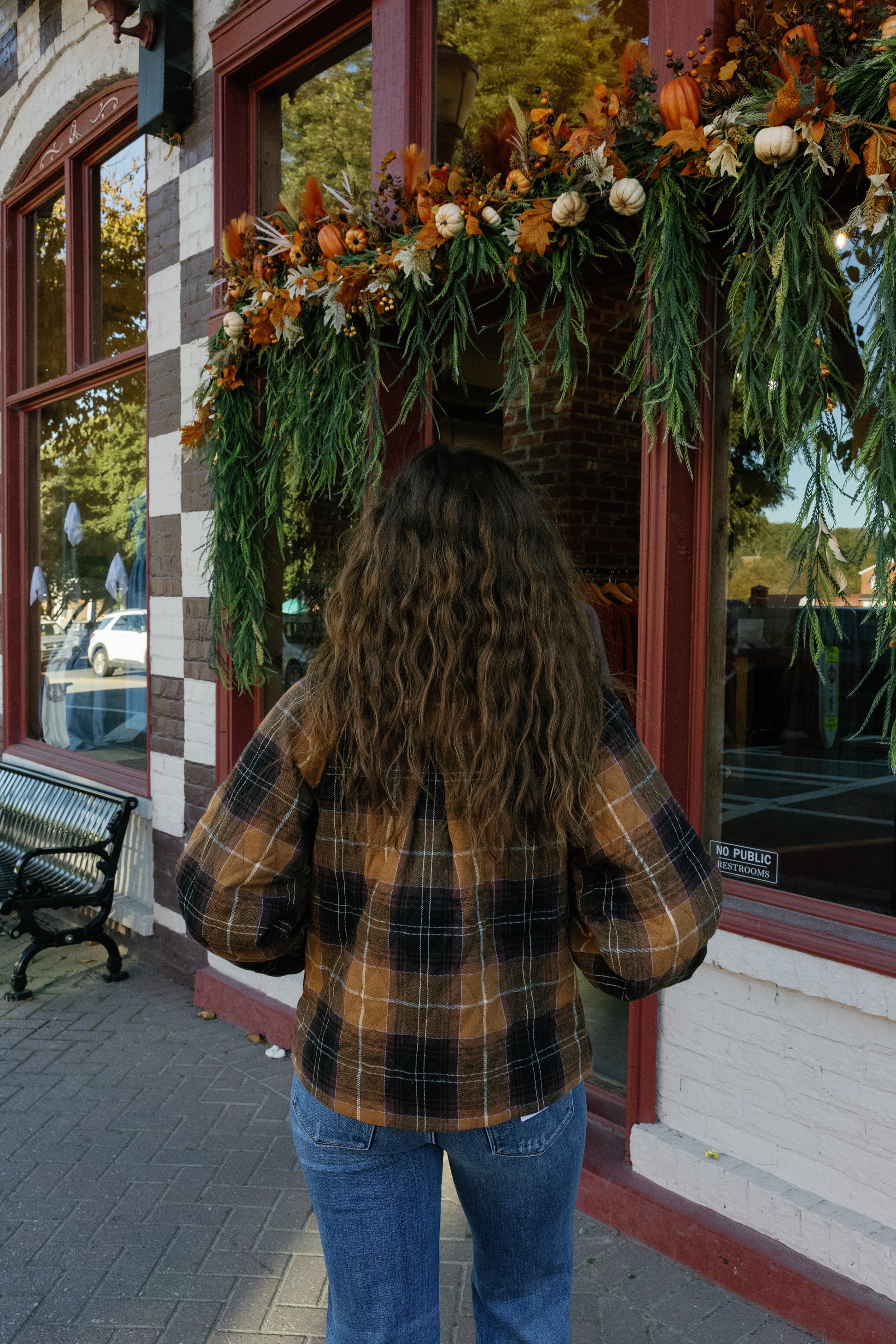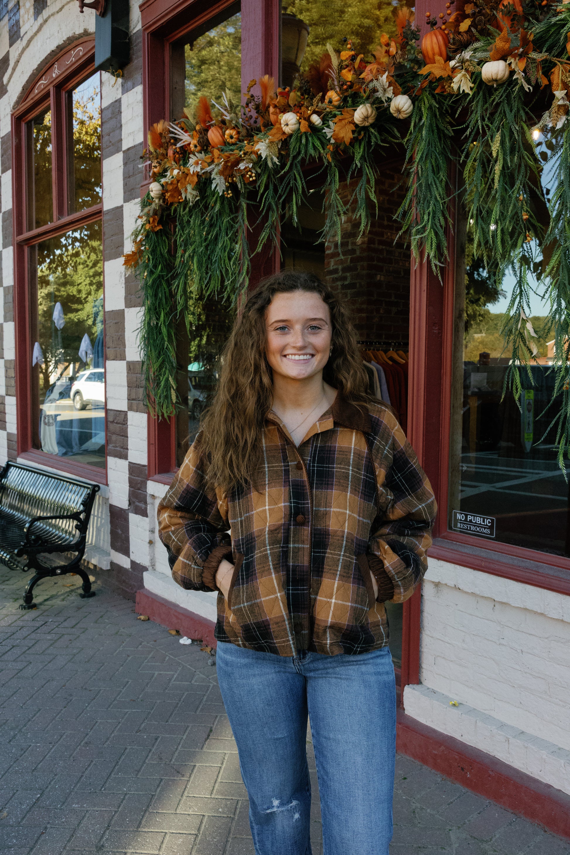 + Plaid quilted jacket with contrast corduroy detail + Corduroy collared neckline + Corduroy covered buttons + Corduroy piping raglan seams + Long puff sleeves + Elastic cuffs in corduroy + Pockets + Lined
