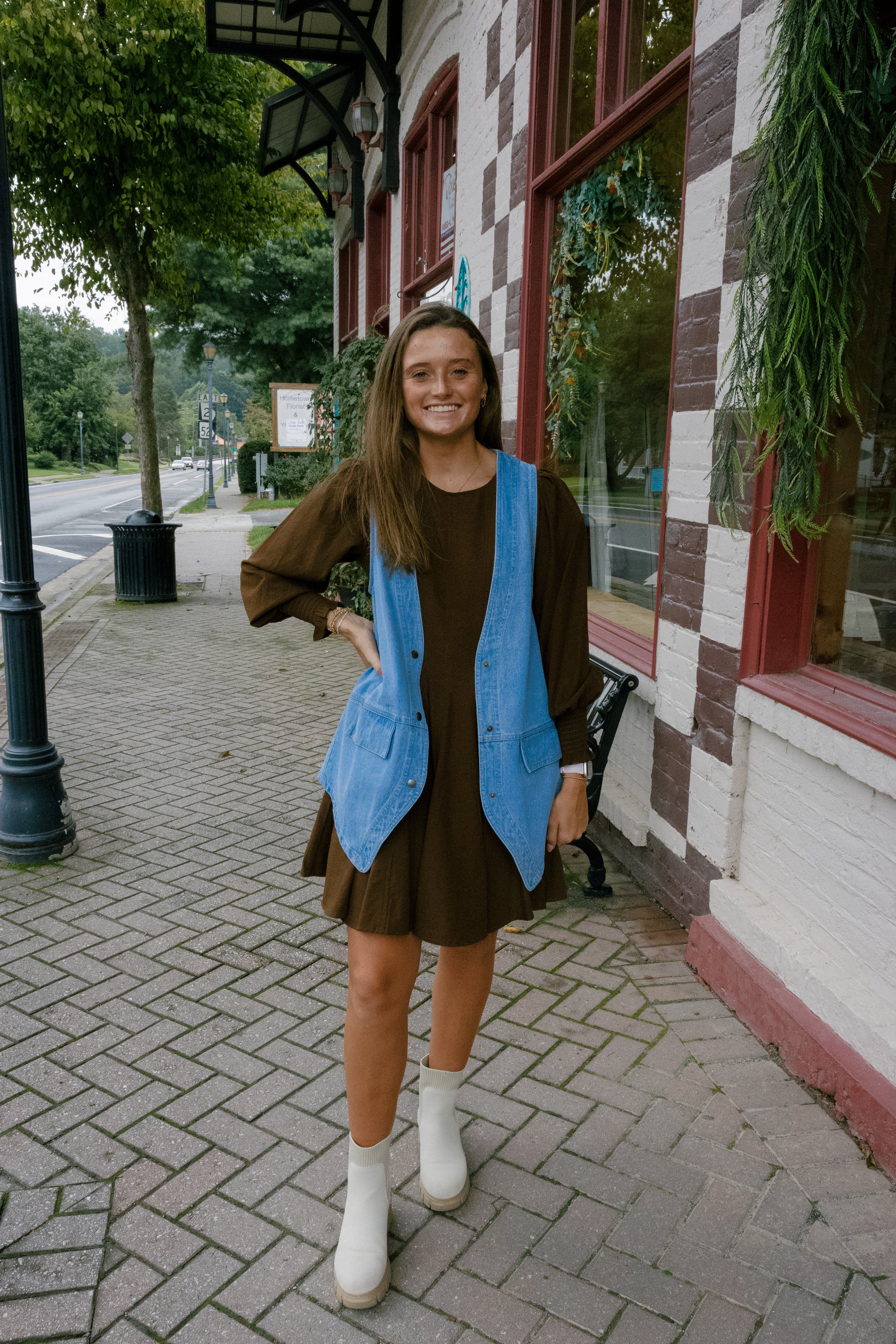 A solid denim vest with the following features: V neckline. Snap-button front closure. Decorative pocket flaps. Sleeveless. Peaked hem. Relaxed fit.