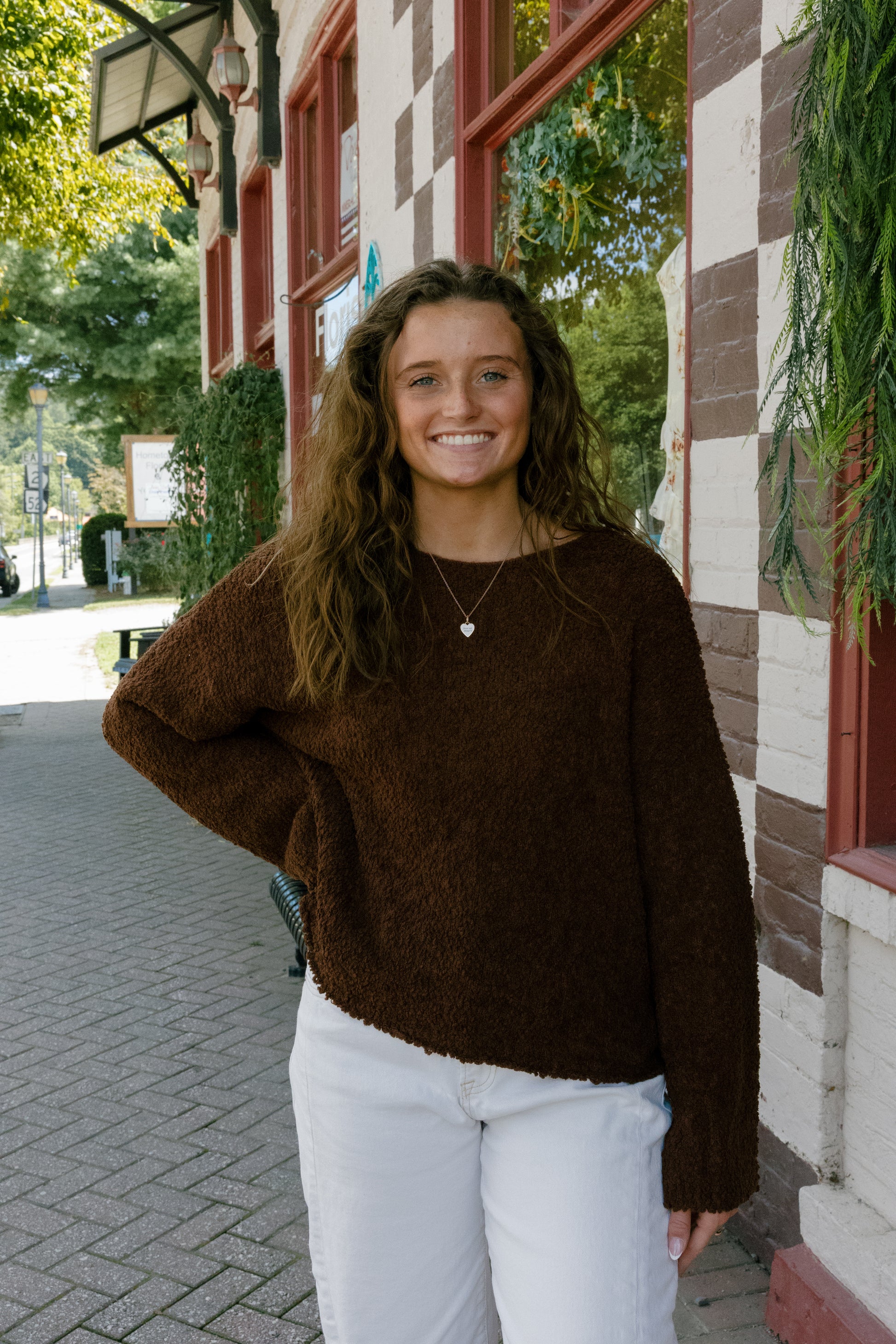 A solid, textured knit sweater with the following features: Boat neckline. Long sleeves. Drop shoulder. Rolled-edge hem. Loose fit.
