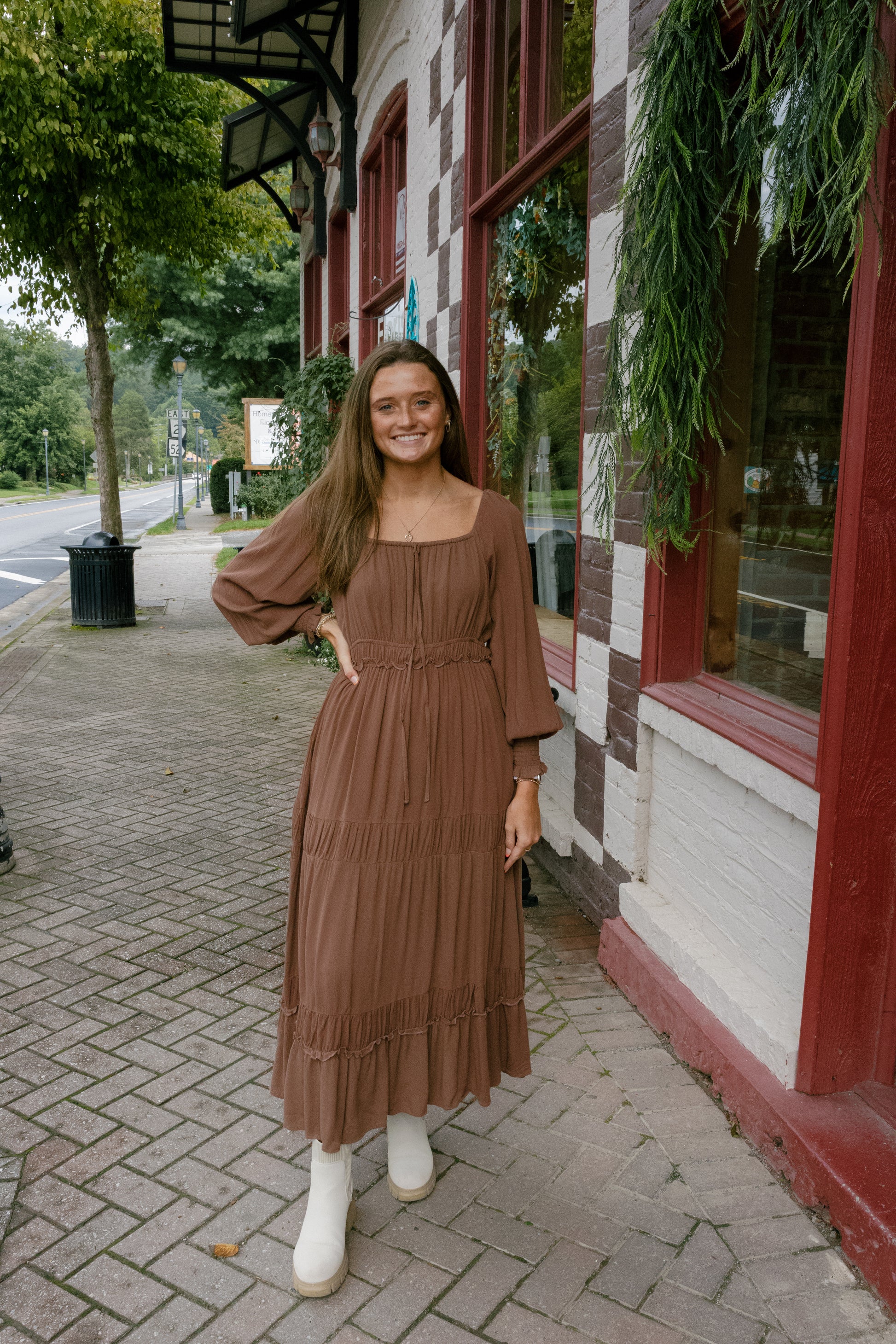 EASY TO WEAR MAXI DRESS FEATURES: - RAYON GAUZE FABRICATION - SQUARE NECKLINE WITH TUNNELED ADJUSTABLE DRAWSTRINGS - GATHERED RUCHED ELASTIC WAISTBAND WITH RUFFLE DETAIL - GATHERED RUCHED TIERED FLOUNCE DETAIL - SMOCKED SLEEVE ENDS - SIDE POCKETS - FULL LINING
