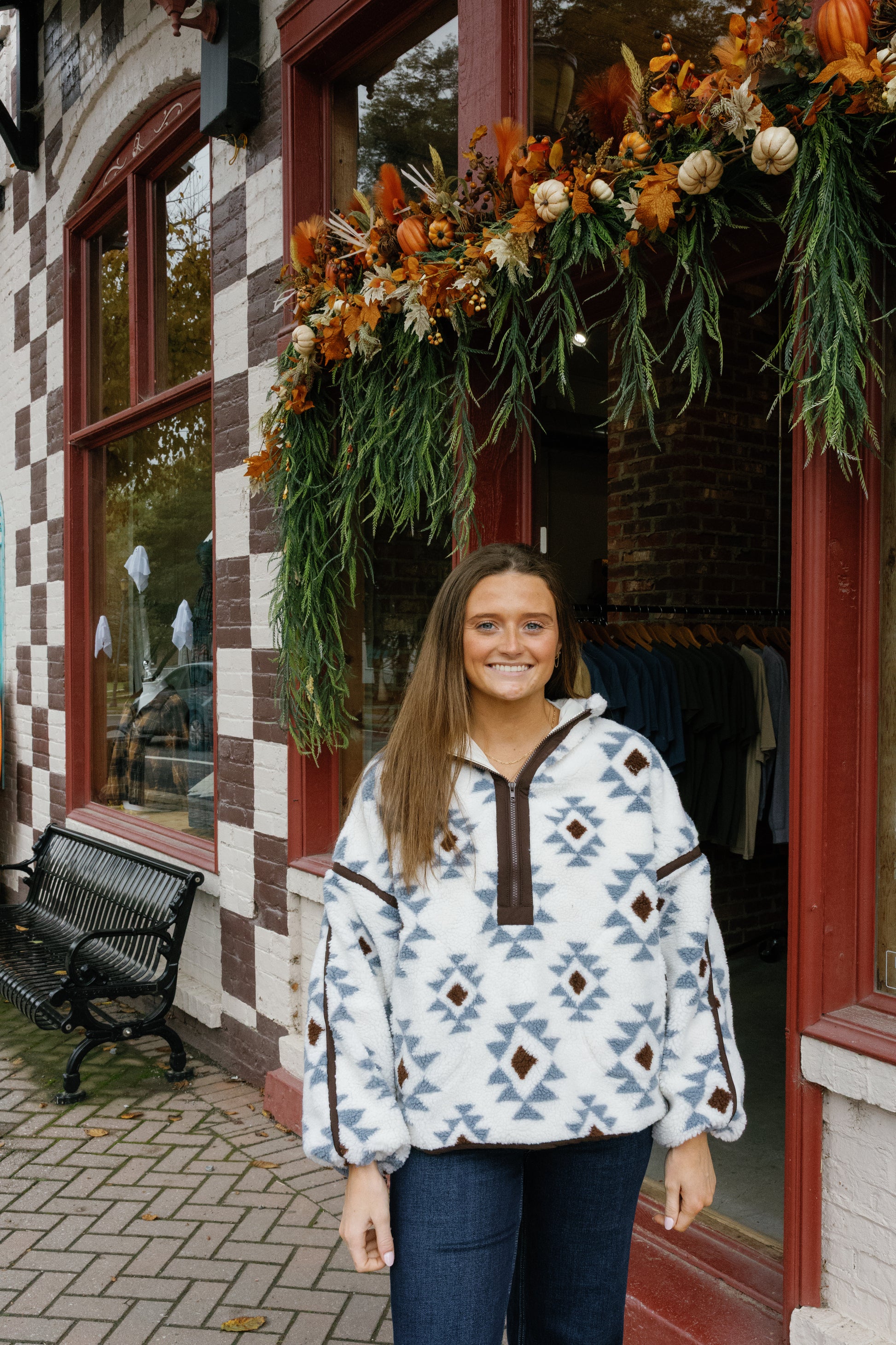 A geometric-print sherpa fleece pullover jacket with the following features: High collar. Half-zip front closure. Side pockets. Long sleeves with elastic cuffs. Drop shoulder. Contrast trim throughout. Unlined. Relaxed fit.