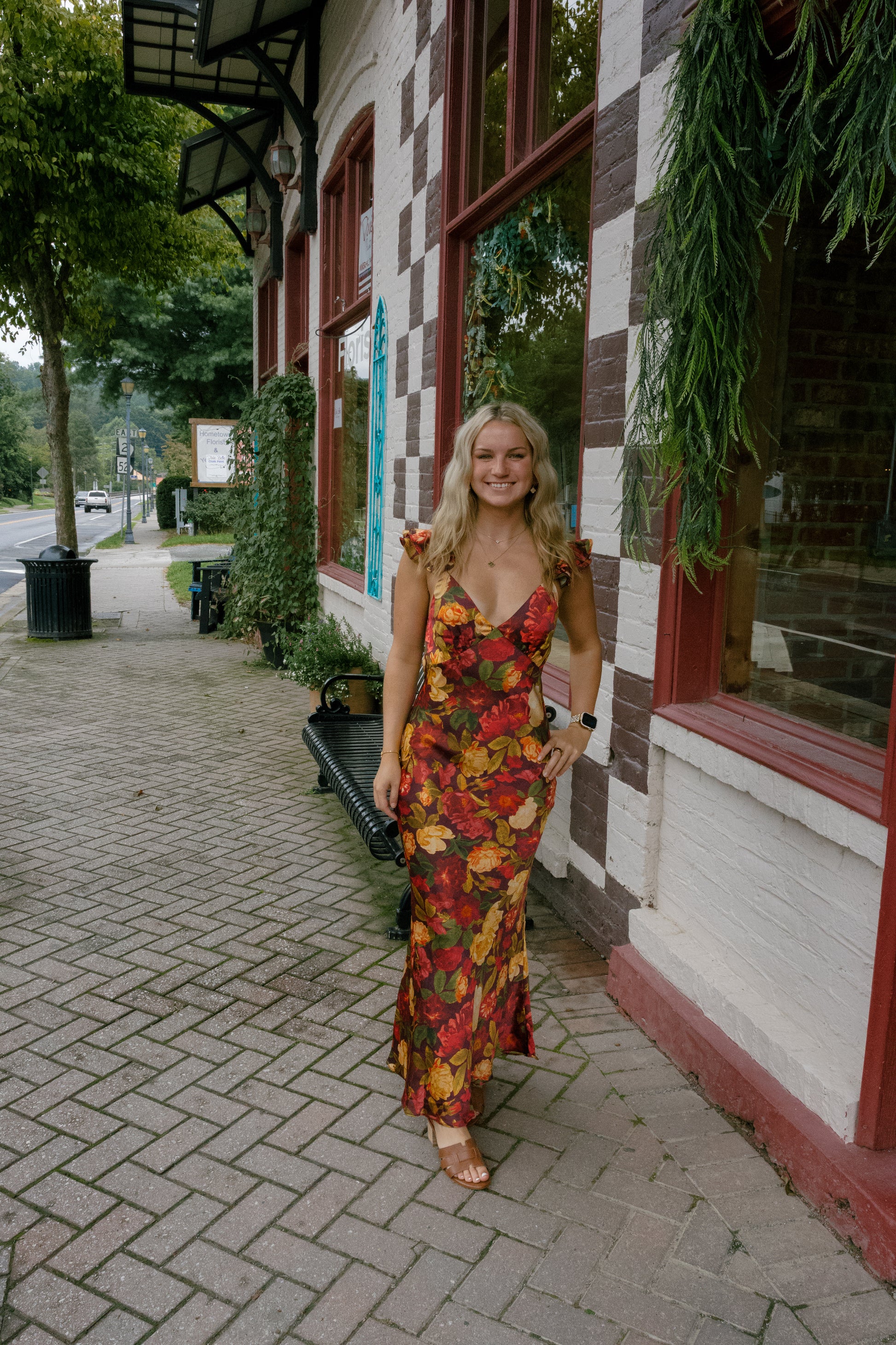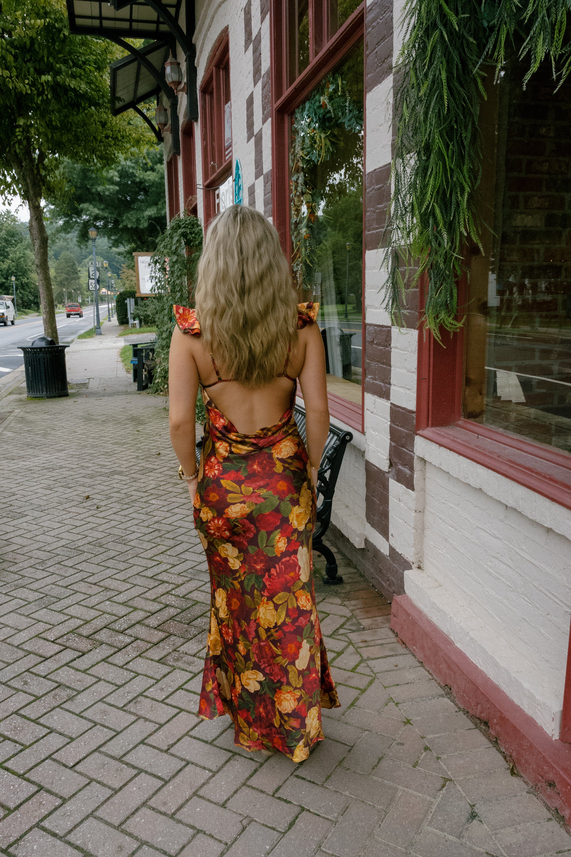 Floral print satin jacquard maxi dress with flutter sleeves. Model is 5'8" and wearing size Small. - V neckline - Chevron underbust seam - Subtle ruched cups - Ruffled shoulders with adjustable straps - Slinder on the back horizontal stripe - Open back with a cowl low back - Hidden side zipper closure - Lined Shell: 100% Polyester Lining: 100% Polyester