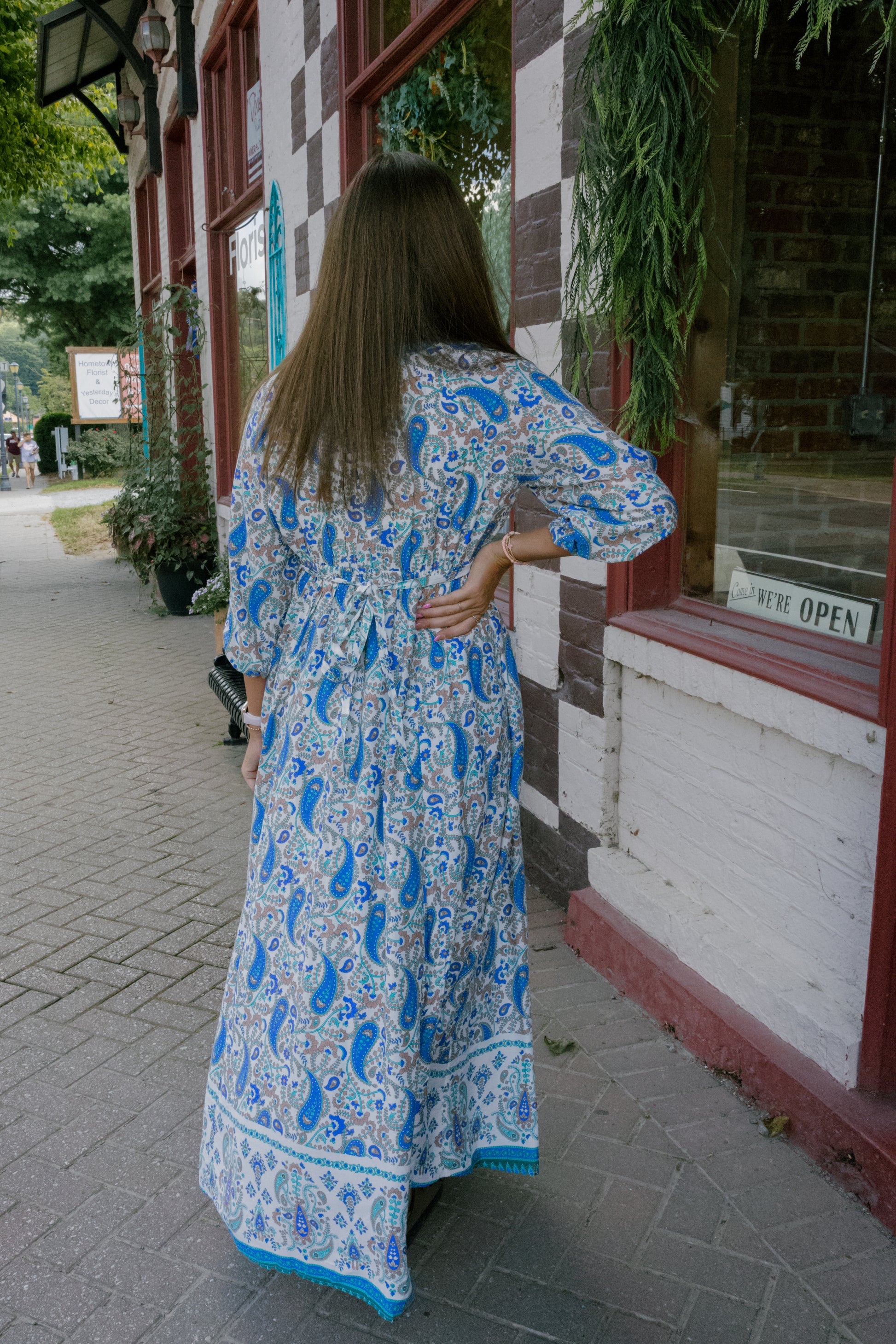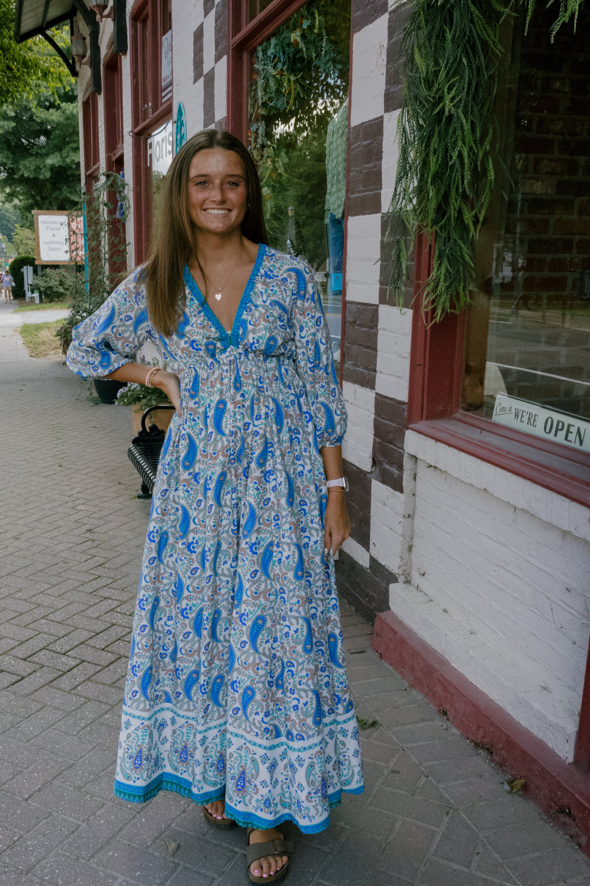 Border print maxi dress features: - Bordered elastic plunge v neck line - Puffed 3/4 sleeves - Bordered flounce - Elastic waistband - Self tie waist - Fully lined.